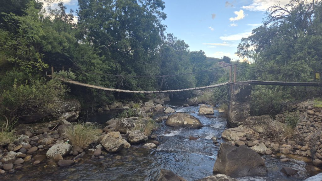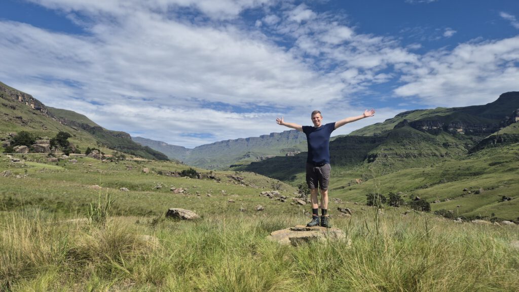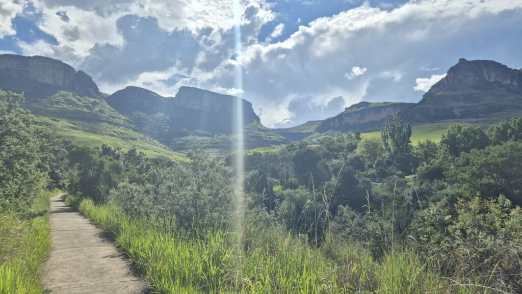 Nach einer Nacht zwischen Warzenschweinen, Gnus und Springböcken ging es am nächsten Tag weiter in Richtung Drakensberge. Nach fast 7 Stunden auf der Straße erreichten wir diese dann in einer spektakulären Witterung – Sonne, Regen, Gewitter, Regenbogen – alles war dabei. In dieser Region haben wir uns ein Weingut, einige Bauernhöfe und den Royal Natal Nationalpark angeschaut, wo wir neben einem natürlichen Pool auch einige Caches finden konnten.