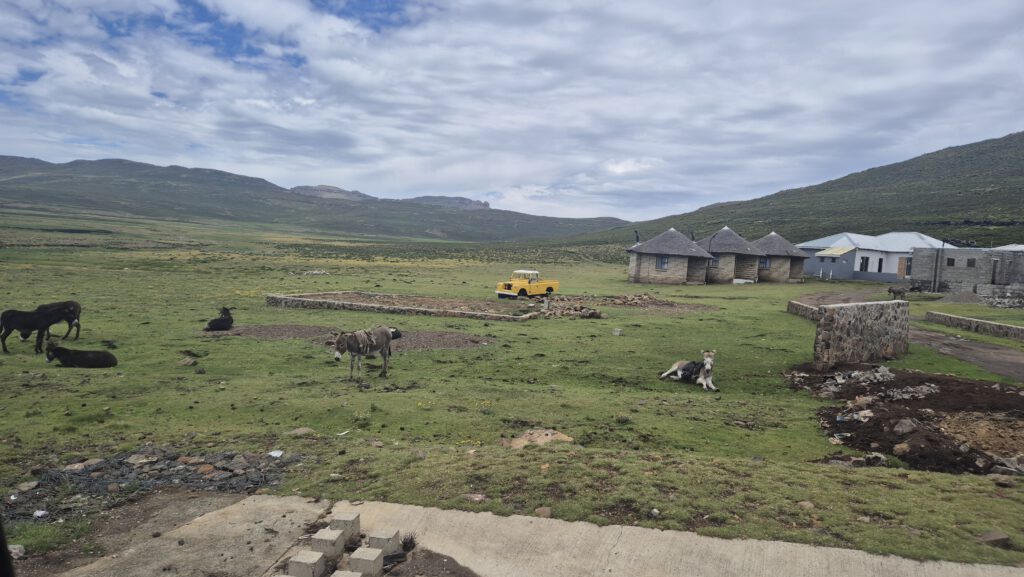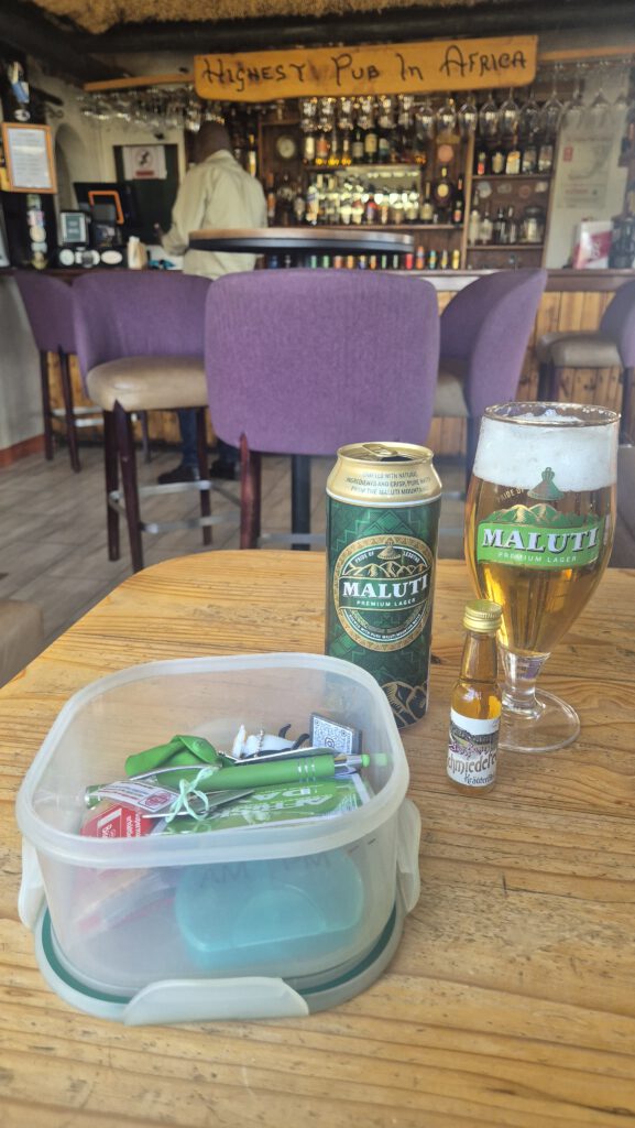 Noch Interessanter als diese Fakten ist aber das Ziel, was man erreicht, wenn man diesen Pass mit einem Allradfahrzeug bezwingt – das Königreich Lesotho, genauer gesagt dessen Hochland. Neben der spektakulären Landschaft, die sich komplett von allem abhebt, was wir bisher in Südafrika gesehen haben, gibt es hier noch einige andere Dinge zu entdecken. Wir fuhren nach dem Erklimmen des Sani Pass und loggen des zugehörigen Virtuals noch etwas weiter bergauf, auf den sogenannten Black Mountain. Nun waren wir auf 3240m Höhe über dem Meeresspiegel – der nächsthöhere Punkt in Afrika ist gen Norden der Kilimandscharo. Unser Guide, der uns übrigens auch den Pass hinaufgefahren hat, hat uns anschließend einen Besuch eines traditionellen Dorfes ermöglicht, um zu erleben, wie die Einheimischen hier ihren Alltag bestreiten. Long story short: Einfach, aber glücklich. Nach etwas Heimatkunde ging es dann weiter zu einem touristischen, aber trotzdem besonderen Ziel: Dem höchsten Pub Afrikas. Dieser befindet sich ein paar Meter hinter der Grenze, mit tollem Ausblick in Richtung Südafrika. Und ja, hier gibt es sogar einen Tradi, den man sich an der Theke „erfragen“ muss. Neben einem leckeren Mittagessen, einem einheimischen Bier und bestem Wetter gab es dann noch ein weiteres Highlight: Wir konnten auf dem Weg zurück nach unten, im Niemandsland zwischen Lesotho und Südafrika gleich zwei FTF’s auf Earthcaches abstauben! Man muss eben auch mal etwas Glück haben und zur richtigen Zeit am richtigen Ort sein.